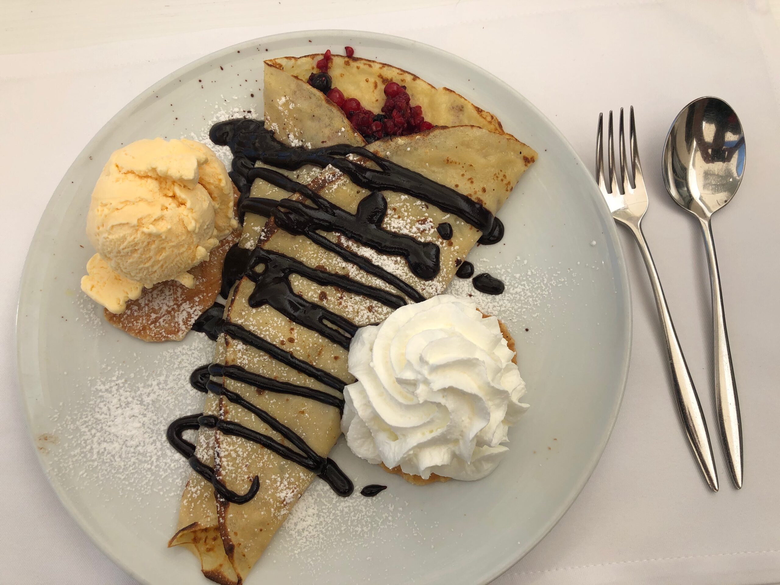 Nach dem Waschen gab es erstmal Frühstück mit leckerem Omelette und Lachs-Toast, und irgendwie haben wir den „Aquafit & Clubtanz“-Kurs im Resort verpasst, weil wir direkt danach noch einen Crêpe gegessen haben – tragisch!