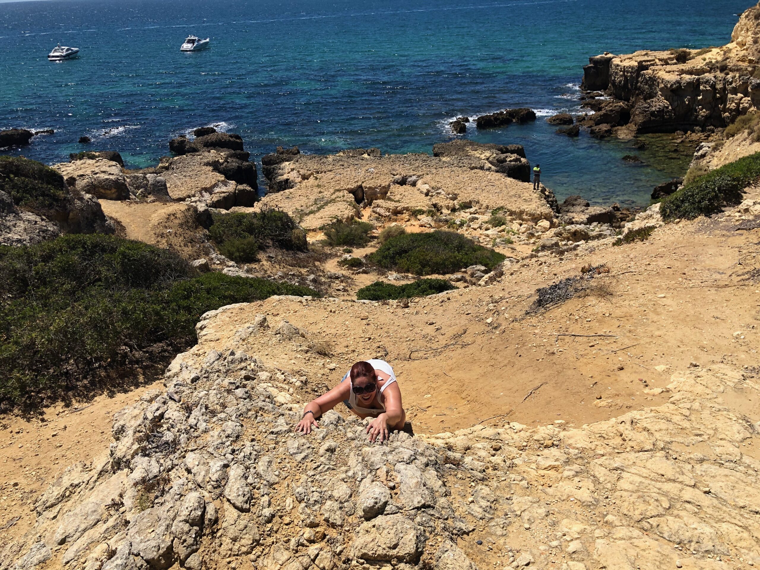 Wir hatten einen Geheimtipp für einen schönen, versteckten Strand in der „Nähe“ erhalten. Um diesen zu erreichen, galt es jedoch zunächst einen gangbaren Weg die Steilküste entlang zu finden. Berücksichtigt man Höhenmeter, kann „Nähe“ rasch sehr relativ werden.