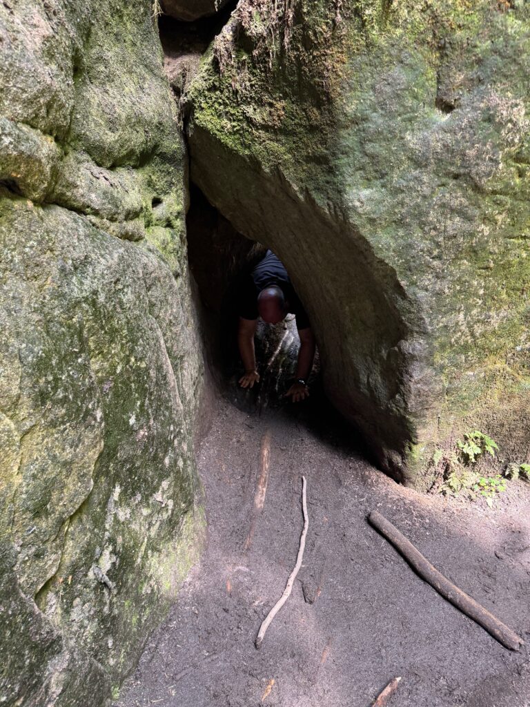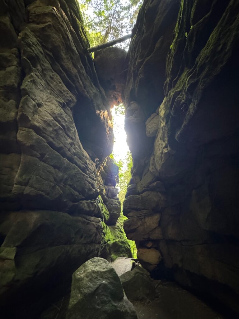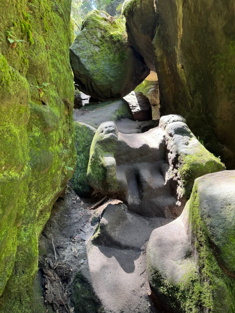 Der Teufel wollte uns wohl in seine Schlucht lotsen (die wir gerade noch vermieden hatten), denn schon wieder tauchte ein Wegweiser dorthin auf. Und weil wir mutig sind, gingen wir gleich durchs erste Tor hinein. Die ersten Hindernisse konnten wir noch mit Kopf einziehen bewältigen, aber dann versperrten uns riesige Felsblöcke den Weg, nur ein kleiner Gang führte hindurch. Im Entengang beziehungsweise auf allen Vieren haben wir uns durchgequetscht. Wir lassen uns doch nicht abschrecken! Belohnt wurden wir mit einer tollen Schlucht mit vielen verwunschenen Ecken. Eine Höhle zum Durchklettern gab es auch.